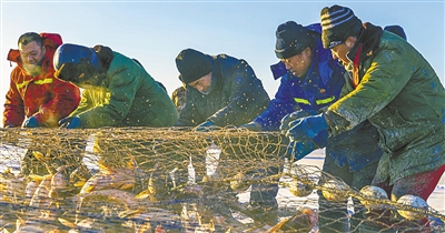 25日,吉林松原,一年一度的查干湖冬捕正在热火朝天展开,渔工们用传统方式围捕冰面下的鱼群,与游客们分享丰收的喜悦。此次冬捕以来,已连续获得6次“红网”,单网出鱼量在10万斤左右。其中,产量最高的一次“红网”出鱼量达到了50万斤。这次冬捕将持续到2023年2月份,预计总捕捞量为1500吨左右。