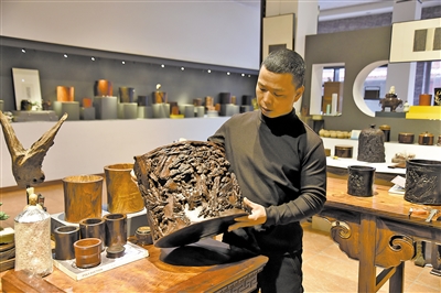 无论是铜雕、竹雕,还是各类筒制品,手工艺品终究也要回归现实,面对能否获得市场认可的考验?谈起经营,欧金新说:“不能只停留在原地,要不安于现状多折腾。”市场风云变幻,为了跟上潮流,他有自己的“秘诀”,“最直接的方式是时刻关注嘉德、保利等各大拍卖行讯息,了解木雕受欢迎的题材、样式,以市场为导向再去更新产品”。欧金新的各类木筒制品广受好评,远销北京、上海、广州等各大城市。