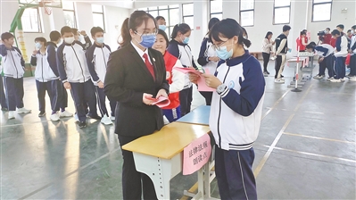 活动现场,设置1个礼品兑换区,设计了法贯古今、违法必究、警钟长鸣等6项益智闯关普法游戏,共派发普及法律的宣传资料150多份,激励朗读法律条文330多人次。这些普法游戏融入了《未成年人保护法》《预防未成年人犯罪法》《刑法》有关知识内容,通过玩游戏读法条赢奖品的方式,让学生寓学于乐,在游戏中积累法律知识,增强学生学法尊法守法用法意识,进一步提升法治意识和法治思维能力。