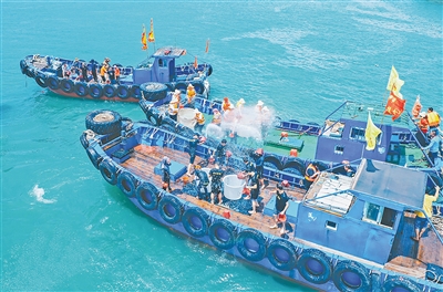 6月29日,在福建省石狮市祥芝国家中心渔港举办的第十二届渔民文化节上,海上泼水活动的参与人员尽情挥桶泼水,场面异常热闹,一时间喊叫声,欢笑声,泼水声交织成一片。 据人民网