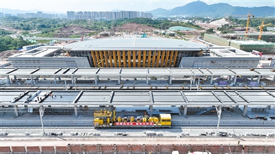 图为7月15日,在福建省龙岩市上杭站,作业人员在进行静态验收工作(无人机照片)。