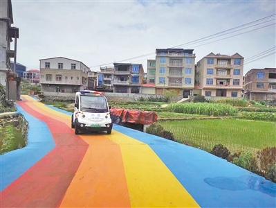 8月11日上午,从郊尾镇东湖村后邦小组步行至后沈村过山小组,黄、橙、红、蓝构成的彩虹路串联起两村的阡陌与农田,在红瓦绿野之间蜿蜒起伏,让人仿佛置身于童话世界。