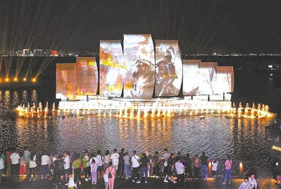 图为 8月27日,游客在北戴河鸽子窝公园欣赏水舞幻影秀《浪淘沙·千古风流》。