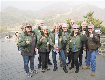 10月29日下午,美中航空遗产基金会、飞虎队老兵及家属一行人在北京参观八达岭长城并合影留念。在抗日战争中,飞虎队与中国军民共同浴血奋战,击落日本军机2600多架。美中航空遗产基金会成立于1998年,该基金会和飞虎队老兵们长期以来在中美两国传播飞虎队故事。