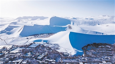 11月14日晚,甘肃省敦煌市迎来今年入冬以来的首场降雪。至15日,雪后的大漠敦煌犹如一片“雪海”,在银装素裹的冰雪世界里,处处玉树琼枝,美不胜收。当地鸣沙山月牙泉、阳关等景区,更是吸引游人体验难得一见的“沙雪交融”美景。图为11月15日,雪后初霁,敦煌鸣沙山月牙泉雪景美不胜收。据中新网