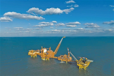 中国海油14日宣布,我国渤海首个千亿方大气田——渤中19-6气田Ⅰ期开发项目成功投产,标志着我国海上深层复杂潜山油气藏开发迈入新阶段。图为11月14日拍摄的渤中19-6气田(无人机照片)。 据新华社
