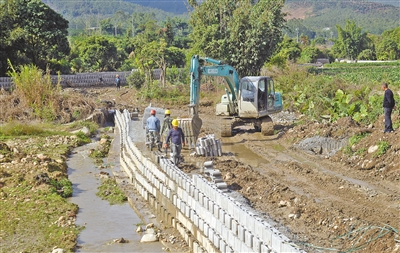 上图:度尾镇中岳溪河道整治工程(二期)项目现场一派热火朝天的施工景象,该工程将改变这条河流以往洪涝频发的状况,还为当地打造一条靓丽的滨水景观带。