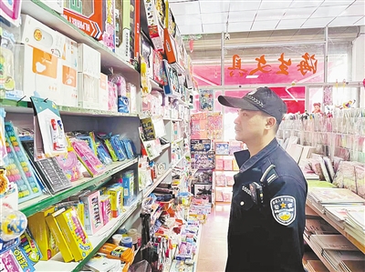 期间,民警走进校园周边的文具店、书店、玩具店等各类经营场所(如图),全面、细致地检查了商家是否违规销售“擦边”手办等具有色情、低俗性质的商品;所售文具、玩具、图书是否存在暴力、恐怖、色情等不良内容;以及是否存在销售“三无”产品或无质量检验合格证明产品的情况。