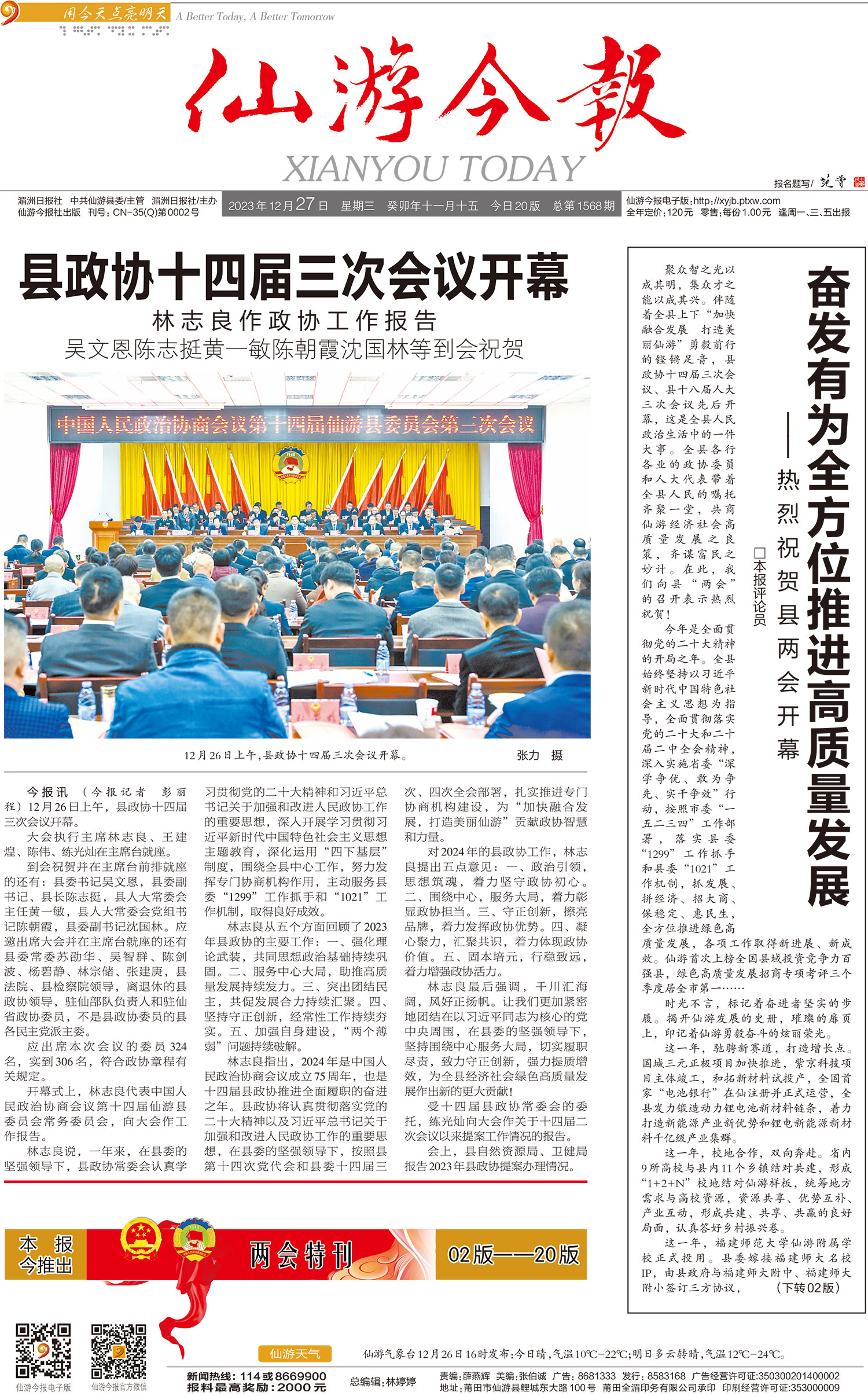 01 导读 02 两会特刊·今闻 03 两会特刊·县水利局 04 两会特刊·县住建局 05 两会特刊·县城市管理局 06 两会特刊·九鲤湖 07 两会特刊·县农业农村局 08 两会特刊·郊尾镇 09 两会特刊·郊尾镇 10 两会特刊·县总工会 11 两会特刊·鲤城街道 12 两会特刊·鲤南镇 13 两会特刊·枫亭镇 14 两会特刊·榜头镇 15 两会特刊·大济镇 16 两会特刊·度尾镇 17 两会特刊·西苑乡 18 两会特刊·游洋镇 19 两会特刊·县供销社 20 两会特刊·仙游农商银行
