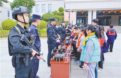 “哇!警察叔叔真帅!”在特警车前,全副武装的特警一亮相,就吸引了同学们的目光(如图)。不少同学还爬上特警车,体验了当一回“小警察”。在警用装备展示区,十余种先进的警械装备一一亮相,包括夜视仪、便携式催泪驱散器、单发捕捉网发射器、防毒面具、手持式激光测试仪等,这些器械都有专人讲解功能及用途。同时,采用现场互动的形式,展示警用无人机进行高空广播和侦查,让参观者眼前一亮。