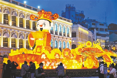 春节临近,澳门特区市政署以“龙腾飞舞庆丰年 喜迎廿五展新篇”为主题,在澳门各区布置贺年灯饰。灯饰日前已全面点亮,吸引市民前来感受过年的气氛。图为市民在澳门议事亭前观赏春节灯饰。 据新华社