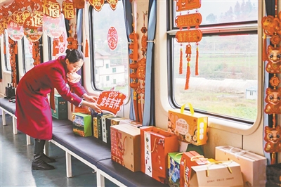 近期,中国铁路成都局集团有限公司联合重庆铁路公安处等部门,在遵义往返重庆西的列车上举办“年货集市”,旅客在列车上“逛年货”、品尝“年夜饭”、欣赏非遗文化表演,感受浓浓年味。2月5日,在遵义开往重庆西的5630次列车上,工作人员在布置“年货集市”车厢。