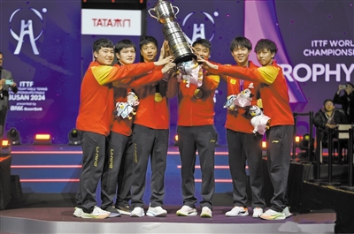 当地时间2月25日,在韩国釜山进行的2024年国际乒联釜山世界乒乓球团体锦标赛男子团体决赛中,中国队3:0战胜法国队,实现世乒赛11连冠。图为中国队庆祝夺冠。 据中新网