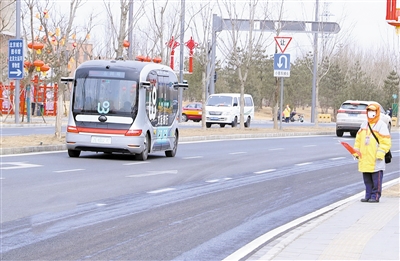 3月4日,一辆无人驾驶小巴在北京地铁郝家府站至城市图书馆间载客运行(如图)。3月3日,北京市交通委在已有常规公交运力保障基础上,借助北京高级别自动驾驶示范区3.0扩区机遇,试点开通三大文化建筑周边自动驾驶接驳服务,乘客可免费试乘无人驾驶小巴,往返于城市绿心森林公园、郝家府地铁站和三大文化建筑。