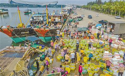 开春时节,南海迎来捕捞旺季。海南渔民在春光明媚的近海海域开展海上春耕,一船船海鱼源源运抵潭门港码头转销各地市场。 据人民图片网