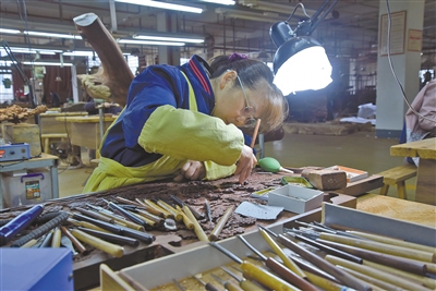 图为在三福红木文化工业产业园,雕刻师在车间内精雕细刻。