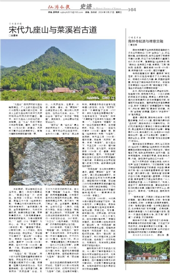 在这条古道的西端起点凤顶村溪边,笔者于2022年10月发现两方宋代石刻。这两方石刻位于“九座寺”门前,应当是该寺僧人所刻。周围诸多桥梁也留有九座寺僧人的石刻,比如“凤顶桥”刻字“大清乾隆丁丑年(1757年)仲秋九座寺主持惠亮修桥”、九座寺后东北“中后桥”刻字“大清乾隆丁丑年仲秋九座住人慧亮……”、九座寺东“尾厝桥”刻字“住山无言施钞募缘,主缘僧明极、无咎、无□仝……后至元戊寅岁(1338年)重造”等。乾隆《仙游县志》所载“九座桥”,在院前,宋天圣二年(1024年)僧法本建,可能是“凤顶桥”前身;另有“侍者桥”,在九座山下,天圣三年(1025年)僧大辩建;双济桥,在九座村,宋宝祐四年(1256年)纪一倡建,县尉黄岩孙撰记。显然,“凤菜古道”南线在宋代已经形成成熟完善的交通干道,并得到社会各界包括僧人的有力支持,能够得到经常性的维护。