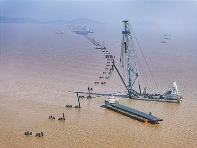 青龙门特大桥是世界级跨海连岛工程——宁波舟山港六横公路大桥二期关键控制性工程,双主跨756米横越青龙门水道,连接舟山佛渡岛和宁波梅山岛两座岛屿。图为3月29日,世界最大跨度三塔钢箱梁斜拉桥——青龙门特大桥西引桥31号墩第11根钢管桩正在施打。 据人民网