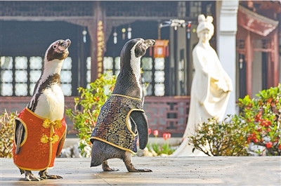 4月1日,南京海底世界人工繁育的两只洪氏环企鹅在饲养员的陪伴下走进莫愁湖公园、绿博园等处,身穿唐装赏花拍写真“享”春意。据悉,洪氏环企鹅适宜生活的温度在15℃至25℃之间,它俩自出生后一直是人工饲养,经常会随着饲养员在温度适宜的时候外出游玩。