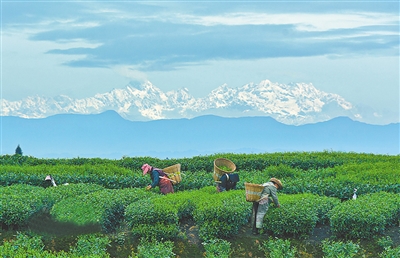 清明时节,四川省雅安市名山区红星镇,春雨后的茶园绿意盎然,雪山茶园交相辉映,与忙碌的茶农身影共同构成一幅美丽的春日劳作画卷。