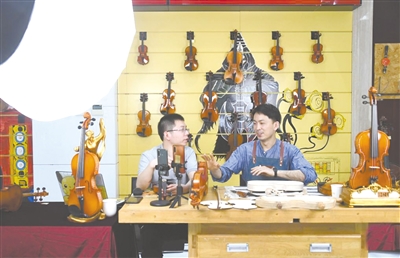 4月29日,中国乐谷·村播学院总部基地启动仪式暨平谷区直播电商领军人才培训计划发布活动在北京市平谷区举行。据介绍,中国乐谷·村播学院总部基地具有强化电商人才培训实训、综合电商运营、名优特产荟萃、新品牌IP孵化、创新服务延展等五大功能,助力乡村振兴。图为工作人员在中国乐谷·村播学院总部基地直播销售提琴。 据新华社