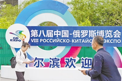 日前,作为第八届中俄博览会主题市的“冰城”哈尔滨,主会场搭建工作正有序进行,城市展会氛围浓厚。据悉,第八届中俄博览会将于5月16日至21日在黑龙江省哈尔滨市举行。图为5月14日,市民经过哈尔滨市南岗区红旗大街上的展牌。 据新华社