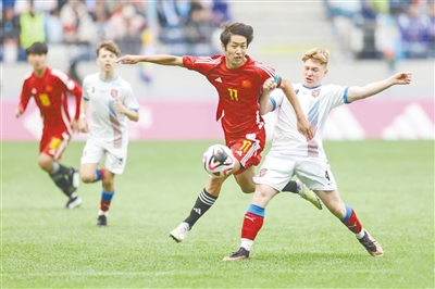 5月18日,2024年国际中体联足球世界杯揭幕战在辽宁大连梭鱼湾足球场举行,中国中学生男子足球三队7比2战胜捷克中学生男子足球一队。图为中国中学生男子足球三队球员黄山(前左)在比赛中带球突破。 新华社
