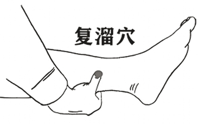 按揉复溜穴 位于小腿内侧,脚内踝尖上两寸(三横指)处。按揉该穴位,有益气、除热、止汗的功效。