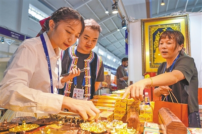 为期6天的第八届中国—南亚博览会7月23日在云南昆明开幕。本届南博会有82个国家、地区和国际组织参会,参展企业达2000多家,其中近一半是境外企业,涵盖了南亚、东南亚所有国家。图为7月23日,人们在南亚馆购买商品。 新华社