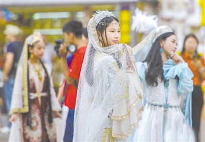 8月12日,新疆乌鲁木齐市大巴扎步行街,游客穿着经过改进的民族服饰拍摄高清写真照。8月,正值新疆旅游旺季,各种民族特色旅拍主题受到游客的追捧。 中新网