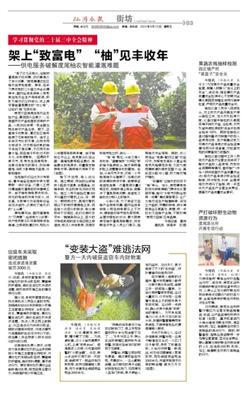 今年以来,为了保证文旦柚产业用电可靠,国网仙游县供电公司在供电服务上下功夫,提前做好季节性负荷预测,合理安排检修计划,最大限度满足柚农灌溉用电需求,并定期组织专业人员上门服务,指导柚农安全用电。同时,该公司结合“党建+配网工程”攻坚行动,发挥党支部战斗堡垒和党员先锋模范作用,及时为度尾镇新建改造变压器11台、高低压线路19公里,助力柚农增产增收。