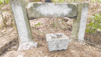 忙碌之中,听闻村人传说还有一处“石人示警”的古迹。随后,在石刻悬崖山上,我们找到了小亭遗址,可惜已遭破坏,杂草丛中石块凌乱。不知何时,有好心人恢复了一个迷你小碑坊,还将横梁倒置。据说石亭中原本供奉着一石人,如今却不知去向,也不知是何方神圣。坊横梁刻有“玄帝行壇”,左右两柱刻“陈汤有礿奉,至元戊寅(前至元十五年1278年或后至元四年1338年)立”,坊下香炉刻“上帝炉,同治丁卯年(1867年)仲冬吉旦立”。翻开地上石料,还发现一块明显遭人为破坏且刻有字的残缺碑,依稀可见“……建修道路募缘芳名开列于左……嘉庆辛酉(1801 年)年仲秋吉日立”,显然这是一块修路纪德碑,却不知因何被移至山顶。