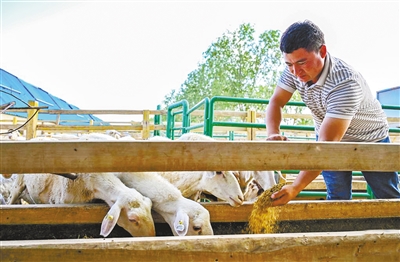 新疆昆玉市地处喀喇昆仑山北麓、塔里木盆地南缘。自2016年建市以来,昆玉市大力发展农工合作社,通过引进优质苗木和杂交改良种畜,实现农业和畜牧业增产,有效带动居民致富增收。图为9月4日,在新疆昆玉市玉园镇和泰新区多胎肉羊养殖基地,养殖户西尔尼亚孜·米吉提在喂羊。和泰新区通过引入多胎萨福克种公羊与湖羊、皮山红羊、和田羊等羊种杂交改良,提升产羔率。 据新华社