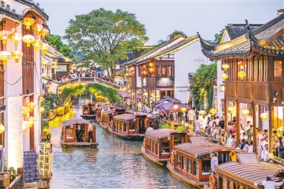 京杭运河苏州段七里山塘,以其独特的地理位置、悠久的历史背景、古色古香的建筑和丰富的文化活动成为众多游客心中的网红打卡地。图为沿河而建的餐馆、茶馆、酒吧、评弹昆曲馆、汉服拍摄等休闲娱乐场所生意兴隆,为当地经济发展注入了新的活力。 人民网