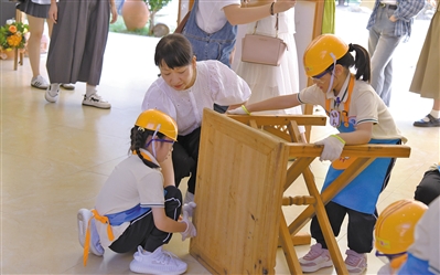 锯木、打磨、拼接……在县实验小学仙作坊里,“快乐的小木工”自主选择工具与材料,利用榫卯结构拼接桌椅、制作各类摆件,装扮校园(如图)。他们每一个动作都透露出孩子们对劳动的热情与专注。美食体验馆里,孩子们剥柚子皮、捣果肉、熬果酱,当喝上一杯香甜可口的柚子茶时,他们的脸上洋溢着满足与自豪的笑容。孩子们还利用废旧牛仔衣物,制作出一个个时尚又实用的包包。