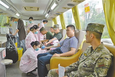 活动现场,前来献血的退役、现役军人及机关党员干部热情高涨,在现场填写献血登记表、进行体检和血液检测后,陆续进入献血车进行献血(如图),整个过程井然有序。