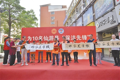 为了表彰先进、树立典范,经各乡镇共建办推荐、县城管局审核,在全县环卫工人队伍中评选出10名“保洁先锋”。活动中,主办方为10名获评人员送上仙游县“保洁先锋”牌匾。同时,邀请全国劳模、县书法家协会主席林自林等上台,为10名“保洁先锋”赠送“城市美容师”书法作品(如图)。