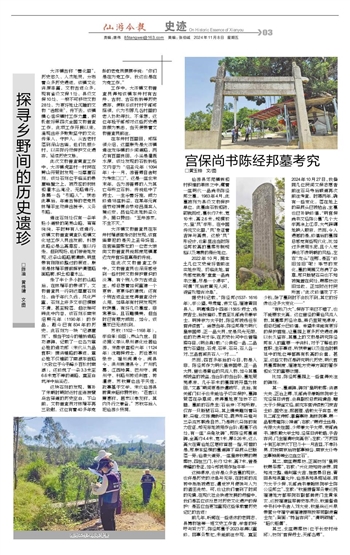 仙游县郊尾镇新和村积埔的果林之中,藏着一座明代一品尚书陈经邦之墓。1983年4月,此墓被列为县级文物保护单位。此墓由石板和砖,砌就而成,墓长约7米、宽10米、高2.6米,规模较大,呈“凤”字形。在中国传统文化里,“凤”象征着吉祥与高贵。这般“凤”形设计,也彰显出当时陈经邦较高的墓葬形制规格以及尊贵的身份地位。