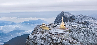 近日,峨眉山迎来今冬第一雪,奇峰、林海、云雾与冰雪绘就了一幅幅银装素裹的美丽画卷。图为峨眉山银装素裹的金顶与远山、云海相映成趣。 新华社