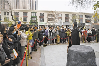 11月24日,天津人民艺术剧院经典话剧《钗头凤》片段在剧院门口的街角上演,让市民游客感受天津城市文化魅力。据了解,话剧《钗头凤》讲述了诗人陆游的一段人生经历。图为当日,演员王继世在表演经典话剧《钗头凤》片段。 据新华社