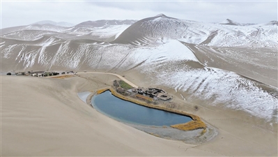 受冷空气影响,11月23日,甘肃省敦煌市迎来入冬以来首场降雪,鸣沙山月牙泉景区雪景如画,美不胜收。图为11月23日拍摄的敦煌市鸣沙山月牙泉景区雪景。 据新华社