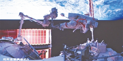 图为12月17日在北京航天飞行控制中心拍摄的神舟十九号航天员蔡旭哲在空间站组合体舱外工作的画面。