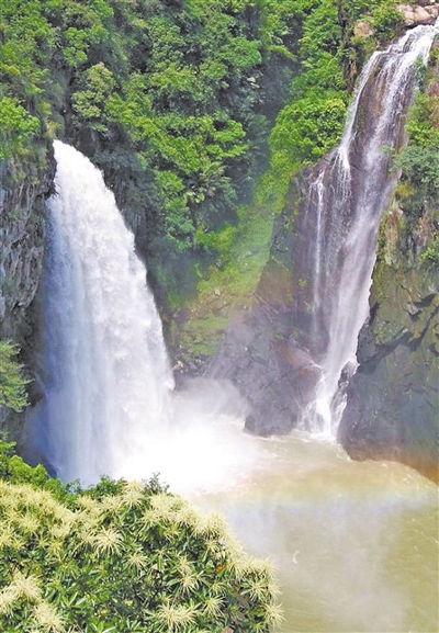 瀑布沿着壁立千仞的峡谷,向前奔流不远,便陡然下坠,又形成了一股数十米高的瀑布,倾盆而下,织成一块永远卷不尽的垂帘,悬挂在空中,“珠帘”便由此得名。珠帘对面的盘龙山顶有两股银白如玉的泉水,沿着赭红色的崖壁倾泻而下,如双龙飞舞,双双落在白龙潭中,与瀑布交映生辉。这里便是被徐霞客称为“峻壁环锁,瀑流交映,集奇撮胜,惟此为最”的玉柱漈。白龙潭水深碧绿如翡翠,潭边群峰环立,山崖陡峭,树木葱郁,翠竹染碧,杜鹃映红。风吹过处, 繁花碧树的倒影在水中晃动着,为深潭增添了几分柔媚。
