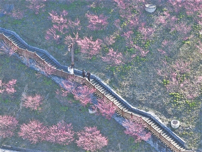 早春时节,三峡库区湖北省秭归县峡江两岸油菜花、山花竞相绽放,春意渐浓。图为2月9日,游客在湖北省秭归县屈原故里文化旅游区游玩。