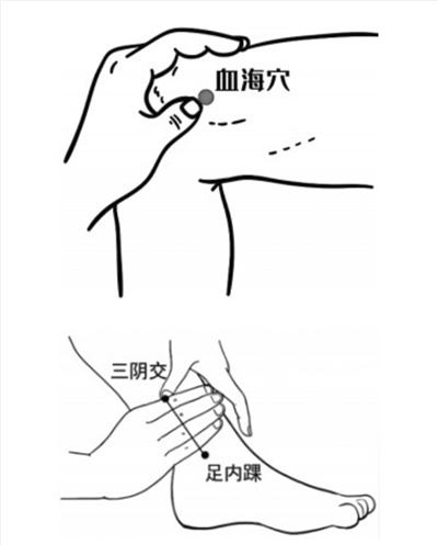 血海穴 常按揉该穴能化瘀止痛。按摩时,用右手的食指和中指捏住左腿的血海穴,用力按压并做顺时针旋转按摩,每次按摩2—3分钟,然后换另一侧操作。