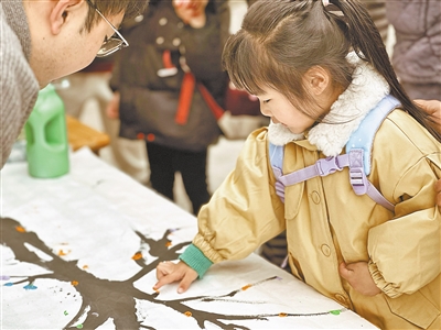 图②:点点春、簪簪春、探探春、闹闹春……木兰幼儿园的小朋友们在小发髻上别上一朵花,美美迎春。他们还在校园里舞龙舞狮闹春、寻寻觅觅探春,用欢声笑语叫醒校园的春意。