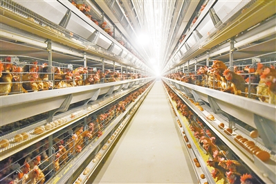 当天进入鸡舍后,陈冠霖操作着机器按下填料开关。随着开关的开启,饲料开始在系统内搅拌,搅拌好的饲料随之通过自动化传输带送进了料塔,很快饲料又通过料塔进入了鸡舍内。据介绍,该公司蛋鸡养殖场引进了自动化成套设备,采用封闭式全自动控制系统,优势在于对鸡舍温度、湿度调节,喂料、饮水、集蛋、清粪等环节全程电控,让鸡舍达到冬暖夏凉的舒适状态。“鸡蛋通过传输带输送到蛋库。”陈冠霖说,蛋鸡只管产蛋,产下的蛋在进入蛋库之前,全程不需要人工捡拾。一个人就能管理一座鸡舍,通过科技赋能,不仅减少了人工成本,也让鸡蛋的品质更有保障。