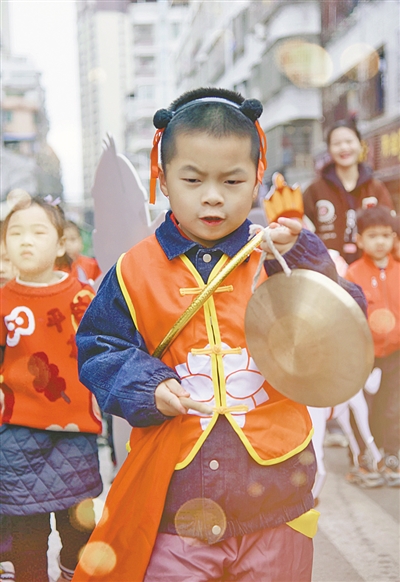 在咚咚锵锵的锣鼓声中,舞龙队率先开路,他们身姿矫健,步伐整齐,宛如一条活灵活现的巨龙,缓缓走出校门。在家长和教师的陪同下,这群萌娃以校园为起点,沿着柳安街一路欢歌笑语,前行不止。
