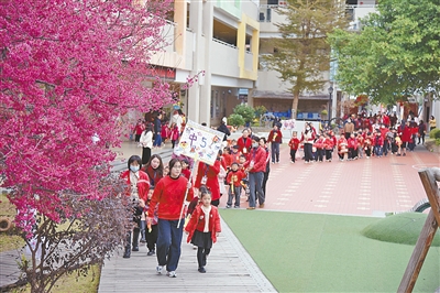 在咚咚锵锵的锣鼓声中,威武的舞龙队开路,锣鼓队、国潮蛇灯队、莆仙戏队、西游记队等,在家长、教师的陪同下,以校园为起点沿街游行,吸引了不少群众驻足围观。
