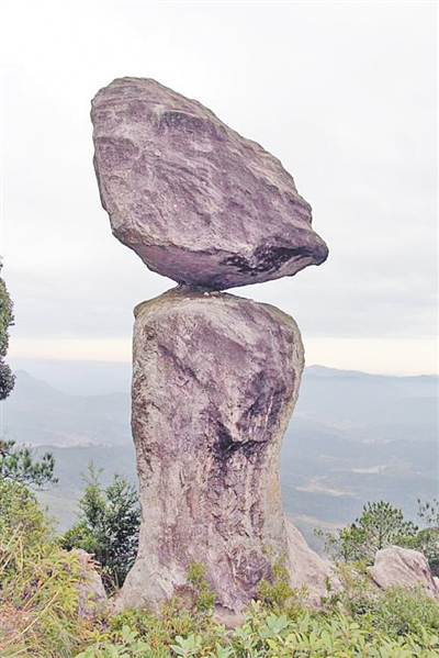 菜溪岩寺东南方,矗立着一块高数丈,上锐如锋的巨石,俗称“飞来石”。据说是明万历年间从山上滚下来的。飞来石下,有一块平滑如砥的大石,上刻“眠云石”三个大字,石上可坐20多人。站在石上往西南眺望,只见狮子峰巍峨挺拔,峻峭逼人,苍翠欲滴。山上有一奇石,拔地而起,摇摇欲坠,从不同方向看,形象各一,俗名蘑菇石,也被人称为“华夏第一石”。